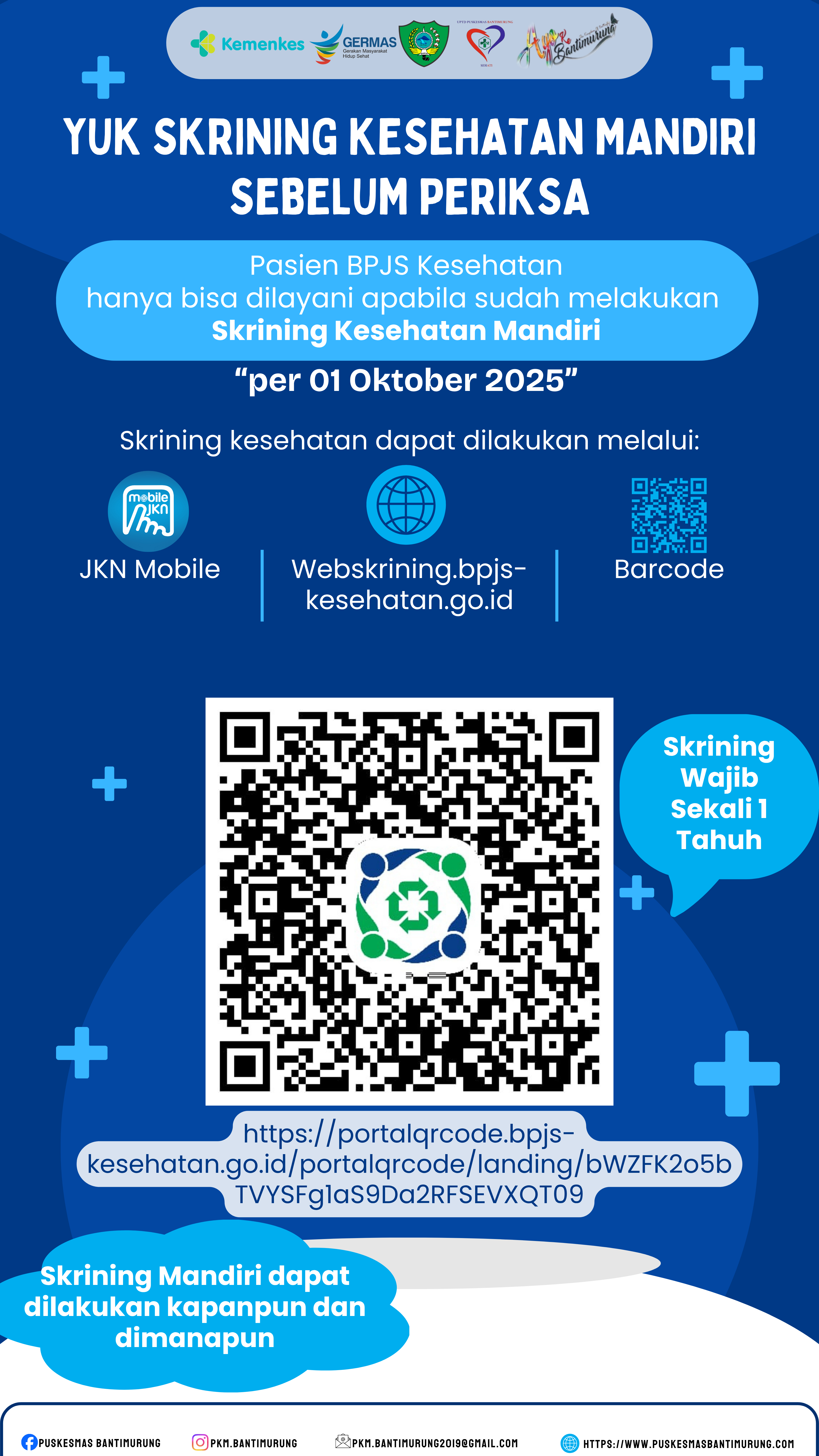 🚨 Mulai 1 Oktober 2025 🚨 Pasien BPJS Kesehatan WAJIB melakukan Skrining Kesehatan Mandiri sebelum diperiksa. Skrining bisa dilakukan dengan mudah banget lewat: 📱 Aplikasi JKN Mobile 🌐 webskrining.bpjs-kesehatan.go.id 📷 Scan QR Code di atas ✨ Skrining cuma sekali setahun, tapi manfaatnya besar buat deteksi dini kesehatan kita. Yuk, jangan tunggu sakit dulu. Skrining sekarang juga! 💙 #SkriningKesehatan #BPJSKesehatan #HidupSehat #CegahLebihBaik